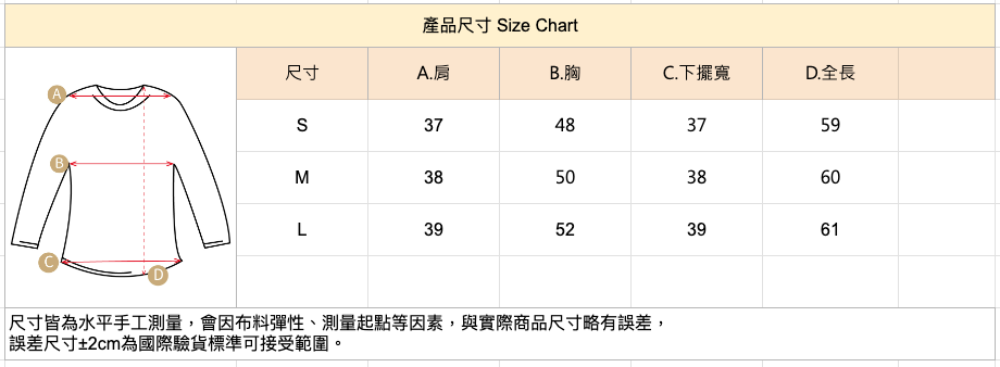 🔺尺寸皆為水平手工測量,會因布料彈性、測量起點等因素,與實際商品尺寸略有誤差,誤差尺寸±2cm為國際驗貨標準可接受範圍。