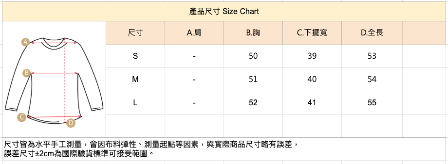 🔺尺寸皆為水平手工測量,會因布料彈性、測量起點等因素,與實際商品尺寸略有誤差,誤差尺寸±2cm為國際驗貨標準可接受範圍。