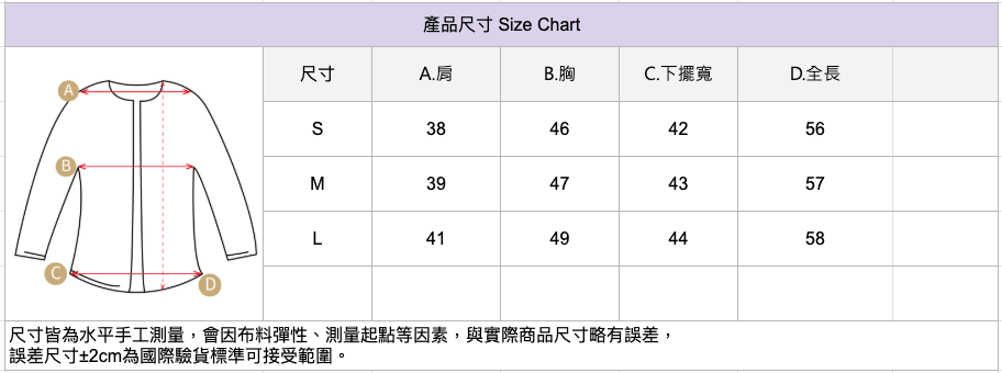 🔺尺寸皆為水平手工測量,會因布料彈性、測量起點等因素,與實際商品尺寸略有誤差,誤差尺寸±2cm為國際驗貨標準可接受範圍。