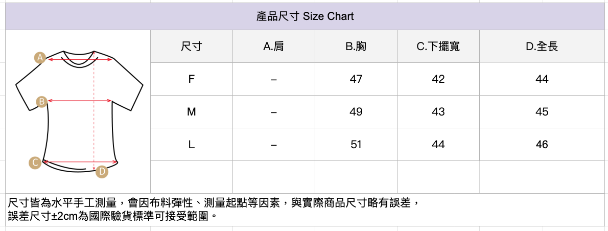 🔺尺寸皆為水平手工測量,會因布料彈性、測量起點等因素,與實際商品尺寸略有誤差,誤差尺寸±2cm為國際驗貨標準可接受範圍。