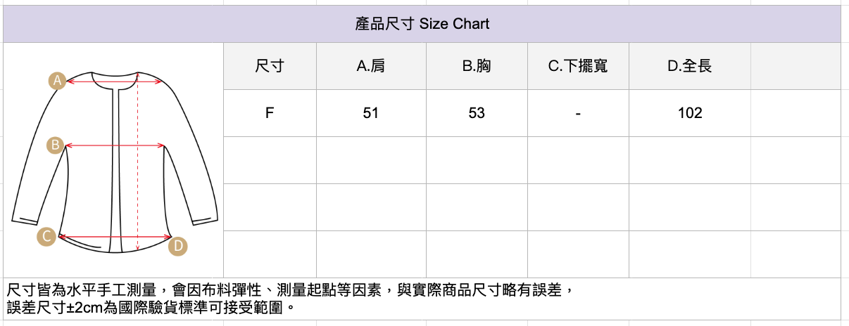 🔺尺寸皆為水平手工測量,會因布料彈性、測量起點等因素,與實際商品尺寸略有誤差,誤差尺寸±2cm為國際驗貨標準可接受範圍。