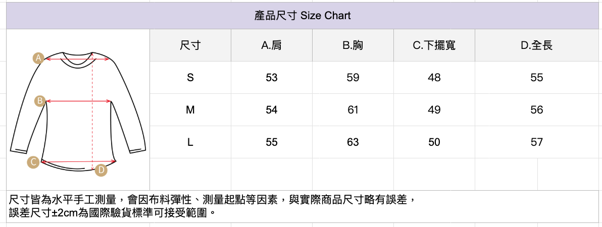 🔺尺寸皆為水平手工測量,會因布料彈性、測量起點等因素,與實際商品尺寸略有誤差,誤差尺寸±2cm為國際驗貨標準可接受範圍。