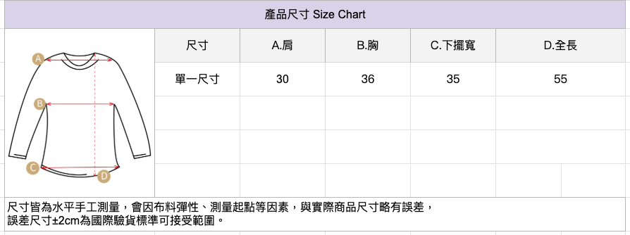 🔺尺寸皆為水平手工測量,會因布料彈性、測量起點等因素,與實際商品尺寸略有誤差,誤差尺寸±2cm為國際驗貨標準可接受範圍。
