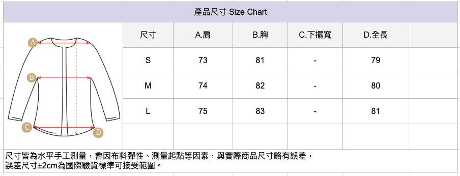 🔺尺寸皆為水平手工測量,會因布料彈性、測量起點等因素,與實際商品尺寸略有誤差,誤差尺寸±2cm為國際驗貨標準可接受範圍。