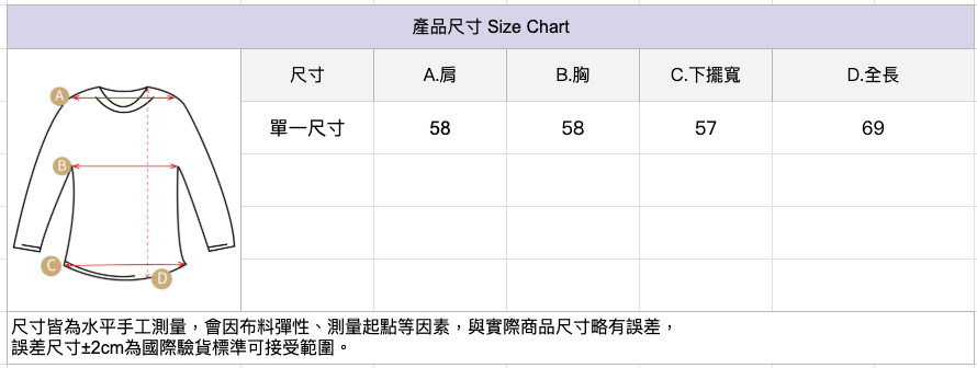 🔺尺寸皆為水平手工測量,會因布料彈性、測量起點等因素,與實際商品尺寸略有誤差,誤差尺寸±2cm為國際驗貨標準可接受範圍。