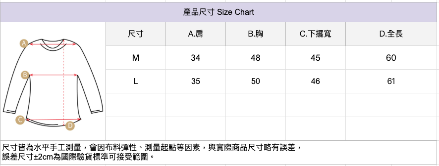 🔺尺寸皆為水平手工測量,會因布料彈性、測量起點等因素,與實際商品尺寸略有誤差,誤差尺寸±2cm為國際驗貨標準可接受範圍。