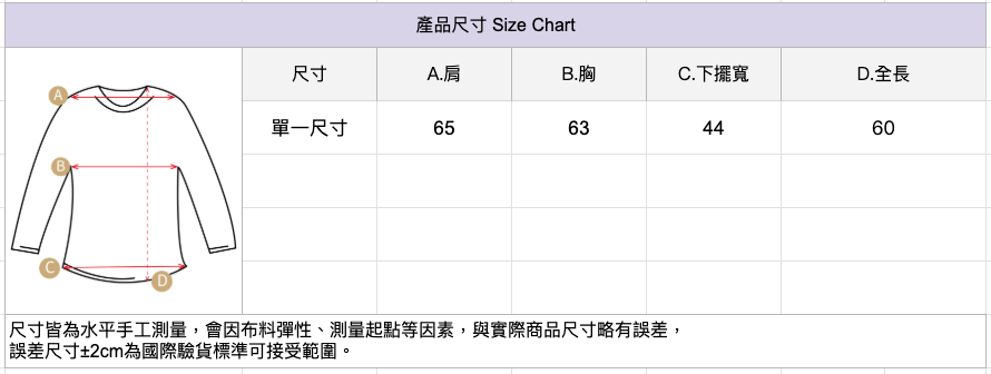 🔺尺寸皆為水平手工測量,會因布料彈性、測量起點等因素,與實際商品尺寸略有誤差,誤差尺寸±2cm為國際驗貨標準可接受範圍。