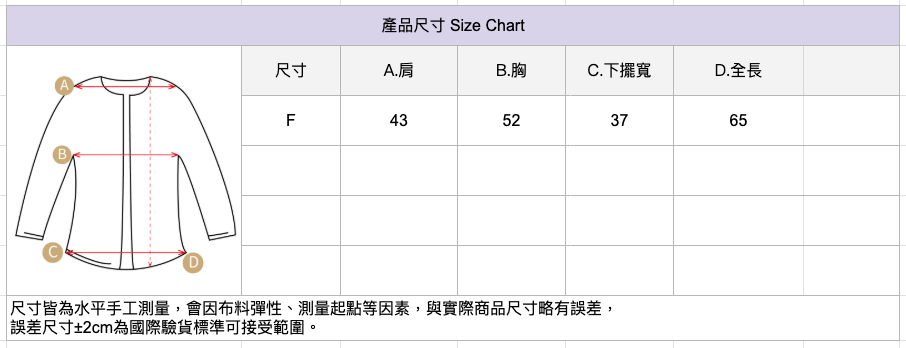 🔺尺寸皆為水平手工測量,會因布料彈性、測量起點等因素,與實際商品尺寸略有誤差,誤差尺寸±2cm為國際驗貨標準可接受範圍。