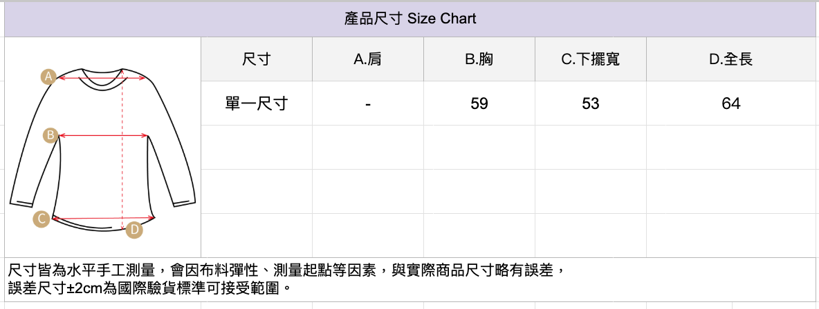 🔺尺寸皆為水平手工測量,會因布料彈性、測量起點等因素,與實際商品尺寸略有誤差,誤差尺寸±2cm為國際驗貨標準可接受範圍。