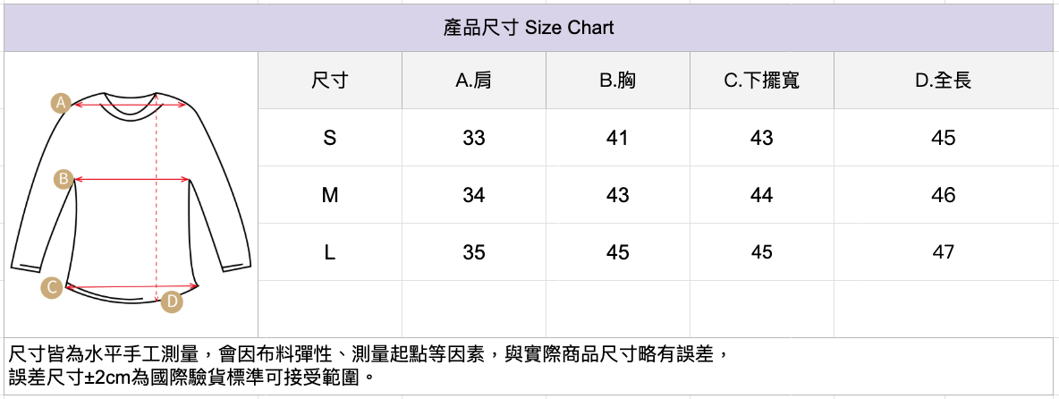 🔺尺寸皆為水平手工測量,會因布料彈性、測量起點等因素,與實際商品尺寸略有誤差,誤差尺寸±2cm為國際驗貨標準可接受範圍。